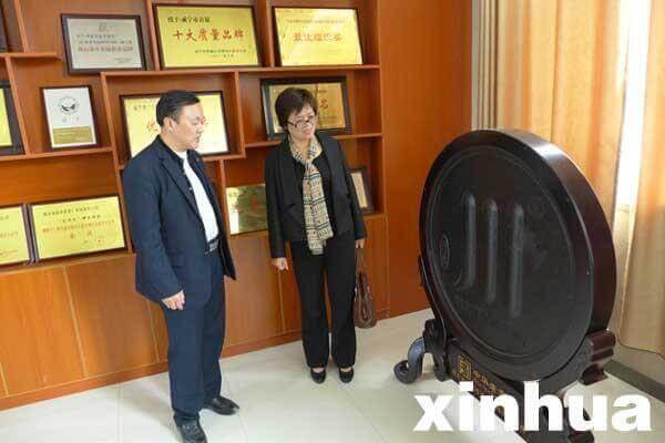 11月5日,趙李橋茶廠副總經(jīng)理甘多平(左)陪同杭州茶葉研究院副院長楊秀芳(右)欣賞“川”字牌巨型茶餅。
