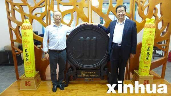 11月6日,趙李橋茶廠董事長李勇(左)與中國茶葉流通協(xié)會常務副會長王慶(右)在“川”字牌巨型茶餅旁合影留念。
