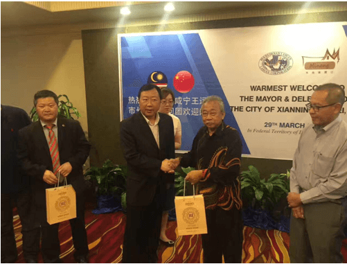 在當(dāng)天晚上舉行的歡迎宴會上,王遠鶴市長表示,咸寧市與馬來西亞納閩市有許多共同點,締結(jié)友好城市能起到互通互融及共同提升作用。咸寧是武漢的后花園,其空氣質(zhì)量和生態(tài)環(huán)境與納閩有共同之處,同是一個旅游資源非常豐富的旅游城市。咸寧在旅游、投資、和貿(mào)易方面擁有很多優(yōu)勢。希望通過納閩市中華商會的互動,加強兩地經(jīng)貿(mào)往來,他邀請商會組團到咸寧走走看看,亦將推薦更多的咸寧企業(yè)到納閩旅游或投資。