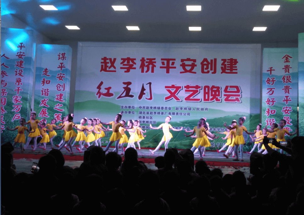 2017年5月4日晚,我們共聚一堂。由中共趙李橋鎮(zhèn)委員會(huì)、趙李橋鎮(zhèn)人民政府主辦,湖北省趙李橋茶廠(chǎng)有限責(zé)任公司、磚茶社區(qū)、趙李橋社區(qū)承辦,羊樓洞社區(qū)、新店鎮(zhèn)老年學(xué)分會(huì)、磚茶社區(qū)老年學(xué)分會(huì)協(xié)辦的“趙李橋平安創(chuàng)建 紅五月文藝晚會(huì)”在我公司燈光舞臺(tái)隆重舉行。