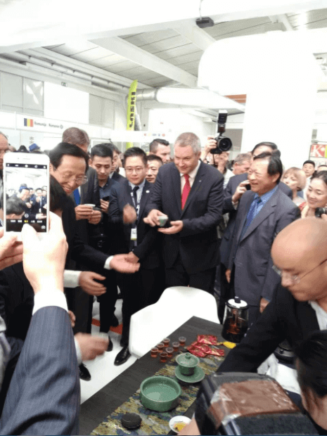 斯洛文尼亞副總理兼農(nóng)業(yè)部部長(zhǎng)戴揚(yáng)•日丹(右二))親臨公司展區(qū)并品飲川字牌青磚茶