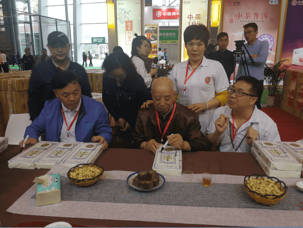 徐金華大師(右)與甘多平先生(左) 聯(lián)手簽名的青磚茶引燃了現(xiàn)場(chǎng)購茶者的熱情