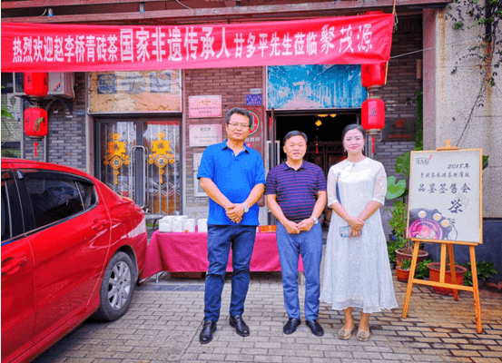 “聚茂源青磚茶體驗(yàn)館”主人王真、王晶夫婦與甘多平(中)在一起