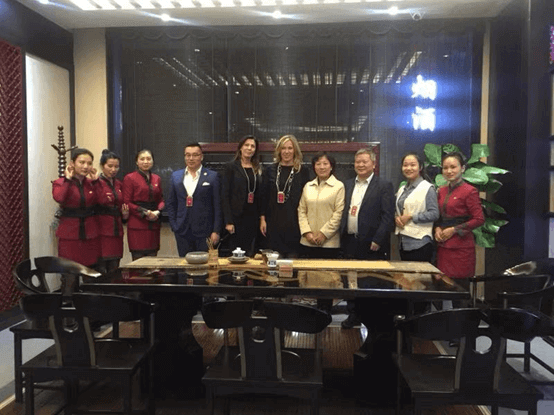 18日晚,湖北省茶業(yè)集團副總經(jīng)理金莉(右四)與咸寧市外事僑務(wù)辦公室黨組書記、主任梁業(yè)偉(右三)接待到訪的中國中部國際產(chǎn)能合作論壇意大利代表團(左五、左六分別為意大利某兩市市長)。