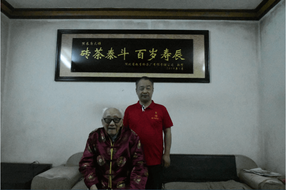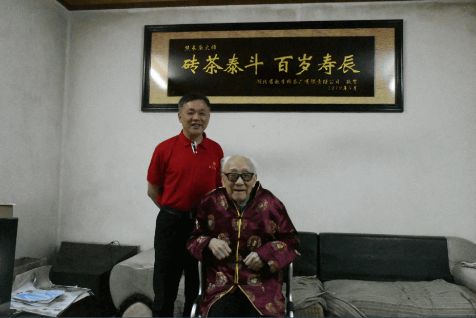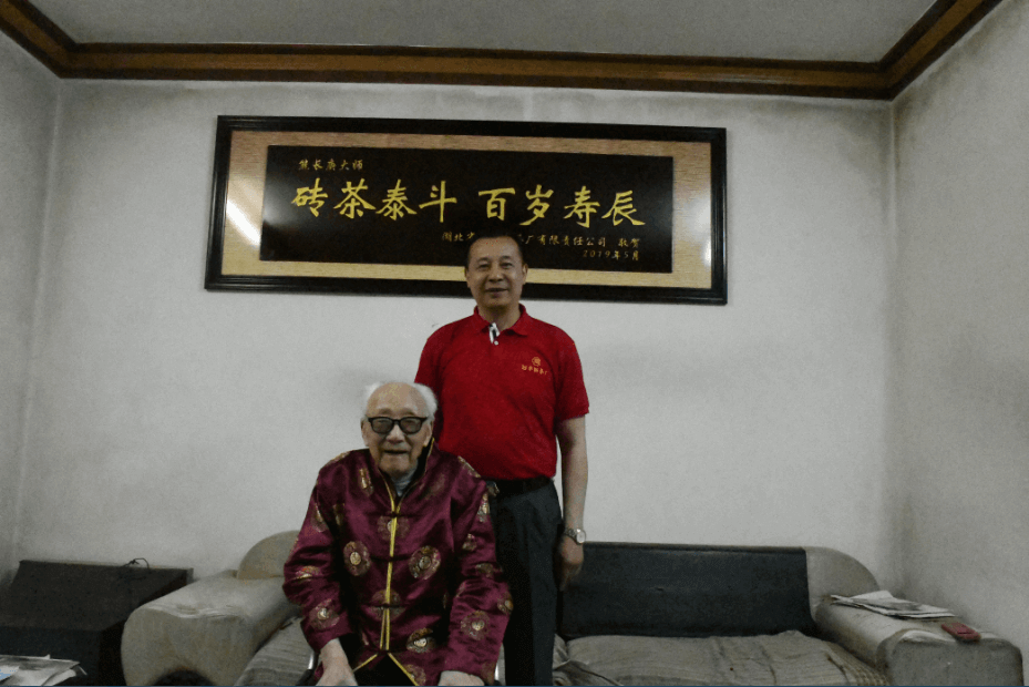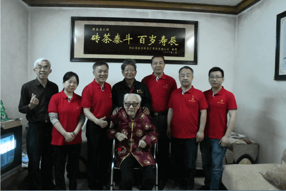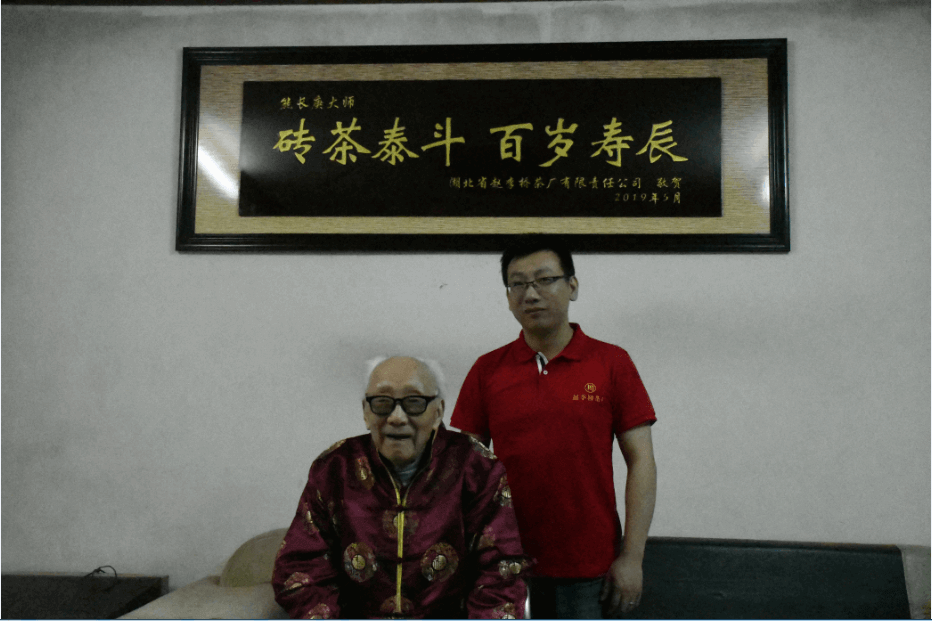 2019年5月8日,是國家非遺“趙李橋磚茶制作技藝”第三代傳承人熊長庚大師100歲的生日,趙李橋茶廠的代表們來到熊老家里為他慶生,并送去了“磚茶泰斗 百歲壽辰”的賀壽牌匾,感謝他為了守護這一塊傳承百年的磚茶做出的貢獻,也祝愿老人家身體健康、福壽綿長。