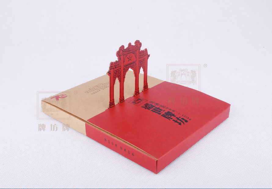 包裝上的牌坊圖案設計成立體狀,在產(chǎn)品陳列的時候可以立起來(寓意立牌坊),再現(xiàn)當年盛世;整個包裝色調(diào)為牛皮紙原色加紅色,加上左上角建廠70周年的紅色燙金標志,體現(xiàn)了廠慶喜慶元素。