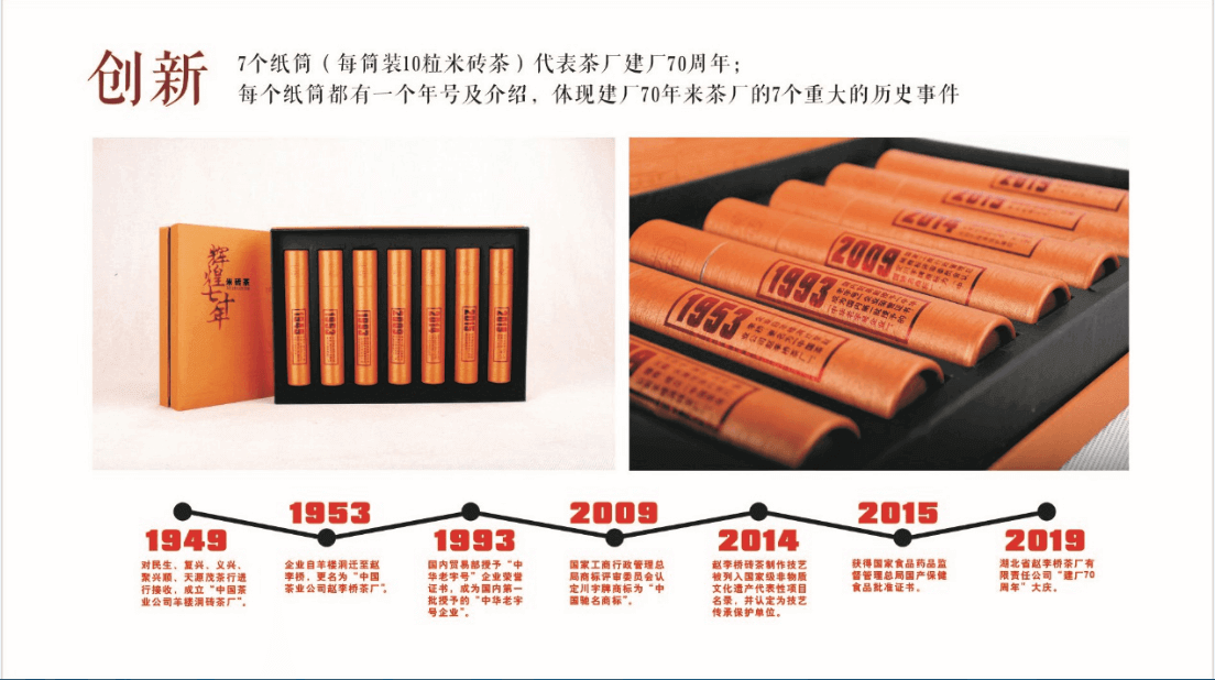 一、創(chuàng)新。7紙筒設(shè)計(jì)(每筒裝10粒米磚茶)代表茶廠建廠70周年。