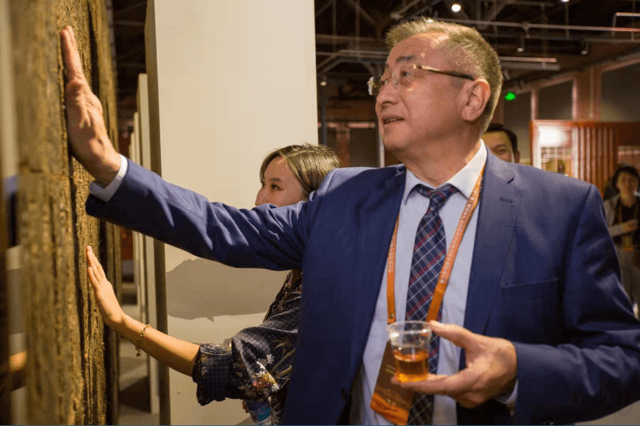 哈薩克斯坦阿拉木圖工商會(huì)主席用手感受青磚茶陳列的墻面。