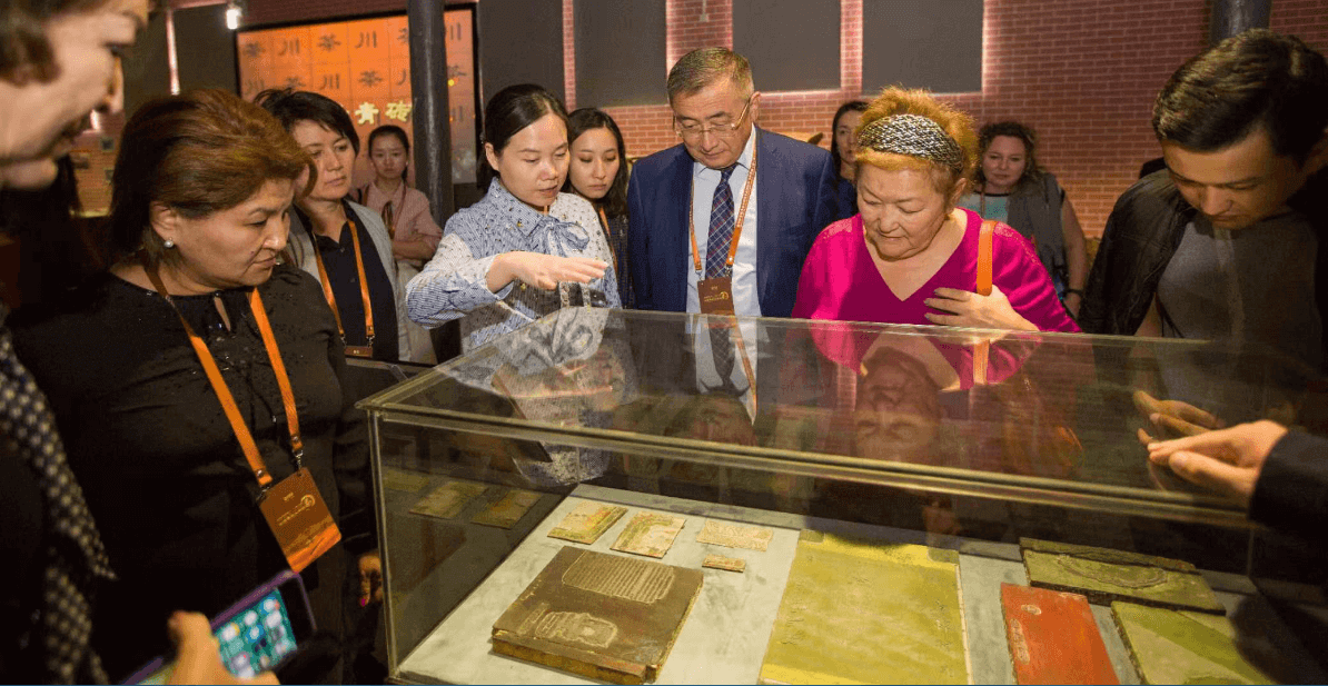 隨后,代表團(tuán)一行參觀了茶廠博物館,由于哈薩克斯坦的官方語(yǔ)言為哈薩克語(yǔ)和俄語(yǔ),陳列的片片俄文青(米)磚茶樣品受到了代表團(tuán)一行的格外關(guān)注。