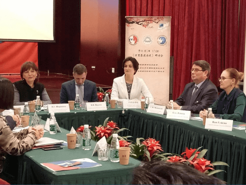 俄羅斯駐華大使館一等秘書、北京俄羅斯文化中心主任卡西亞諾娃(中)主持研討會。