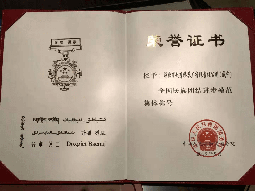 12月18日,湖北省民族團(tuán)結(jié)進(jìn)步表彰大會(huì)舉行。會(huì)議宣讀了湖北省榮獲全國(guó)民族團(tuán)結(jié)進(jìn)步模范稱號(hào)的集體和個(gè)人名單、湖北省民族團(tuán)結(jié)進(jìn)步先進(jìn)集體和先進(jìn)個(gè)人表彰決定。湖北省趙李橋茶廠有限責(zé)任公司榮獲“全國(guó)民族團(tuán)結(jié)進(jìn)步模范集體”稱號(hào)。