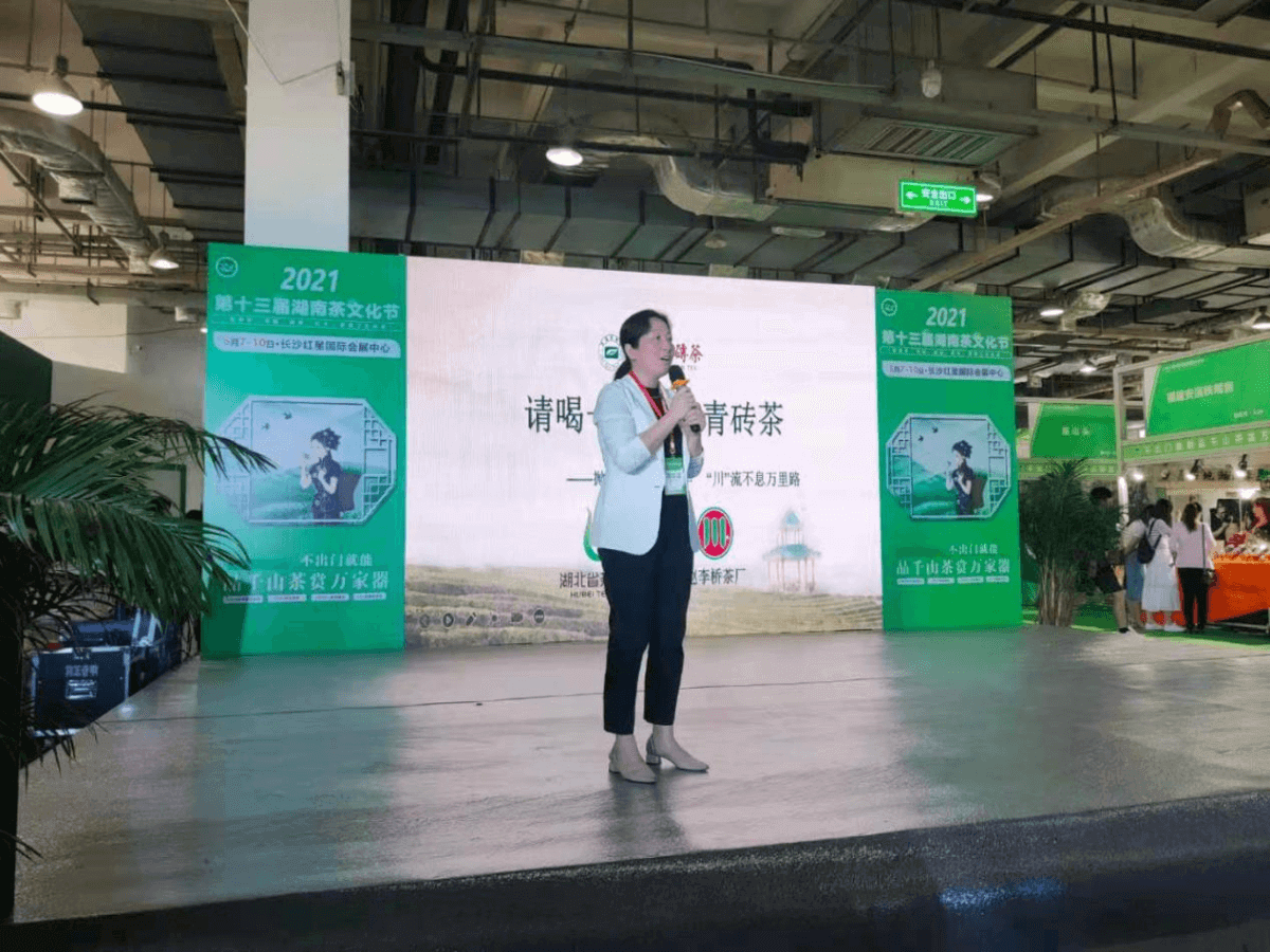 湖北省茶業(yè)集團總經(jīng)理金莉現(xiàn)場推介赤壁青磚茶。