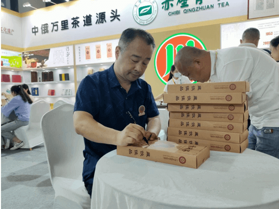 趙李橋磚茶制作技藝第五代傳承人為青磚茶簽名。