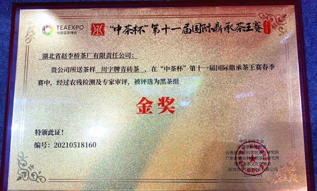 湖北省茶業(yè)集團(tuán)趙李橋茶廠“川”字青磚茶斬獲“中國(guó)茶界奧斯卡”金獎(jiǎng)