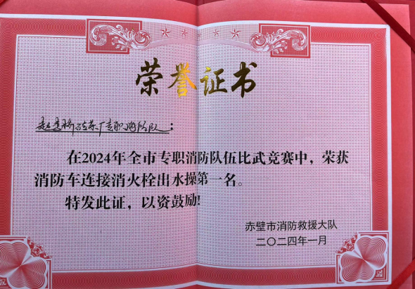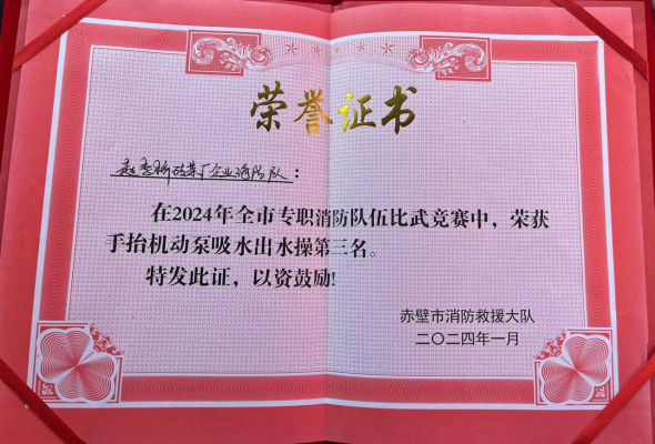 1月10日-12日,赤壁市專職消防隊伍比武競賽暨輪訓(xùn)在赤壁市東風(fēng)消防救援站 (赤壁市應(yīng)急救援中心 )舉行,全市16家企事業(yè)單位的專職消防隊伍參賽。趙李橋茶廠專職消防隊共計5名隊員參賽,在比賽中大放異彩,以卓越的表現(xiàn)贏得了團(tuán)體賽第一名,以及手抬機(jī)動泵吸水出操第三名、消防車連接消火栓出水操第一名的好成績。