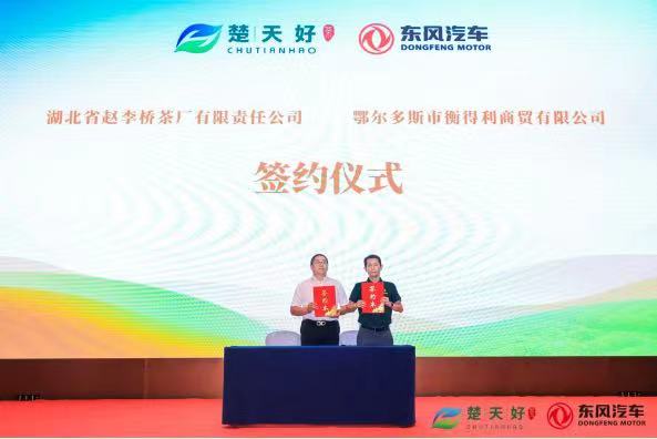 在楚天好茶現(xiàn)場簽約環(huán)節(jié),湖北省趙李橋茶廠有限責(zé)任公司與爾多斯市衡得利商貿(mào)有限公司進(jìn)行簽約儀式。