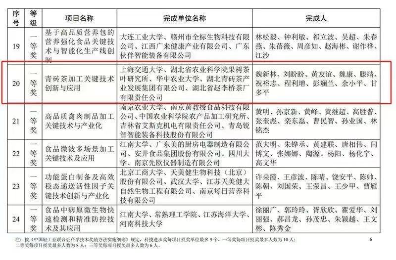 日前,中國輕工業(yè)聯(lián)合會官網公布了2024年度中國輕工業(yè)聯(lián)合會科學技術進步獎建議獲獎項目名單。其中,湖北省茶業(yè)集團旗下湖北省趙李橋茶廠有限責任公司聯(lián)合上海交通大學、湖北省農業(yè)科學院果樹茶葉研究所、華中農業(yè)大學、湖北青磚茶產業(yè)發(fā)展集團申報的《青磚茶加工關鍵技術創(chuàng)新與應用》項目,在眾多申報項目中脫穎而出,榮獲科技進步獎一等獎。