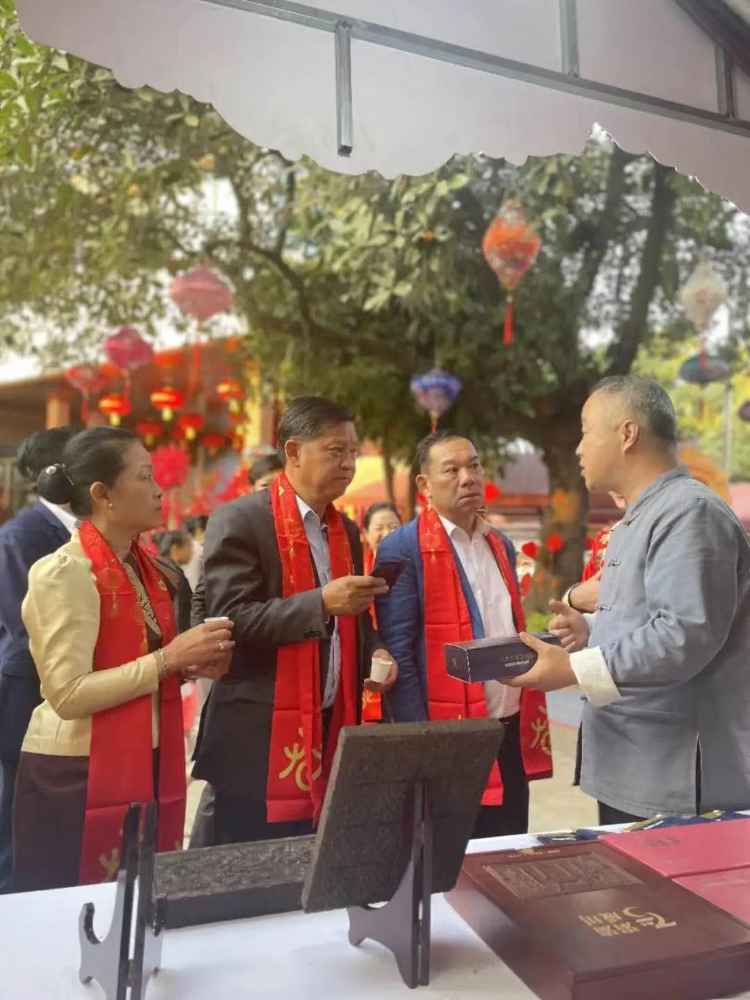 向老撾人民革命黨中央宣傳部副部長、《人民報》總編輯萬賽·達(dá)溫雅贈送涓滴成川75周年紀(jì)念米磚茶