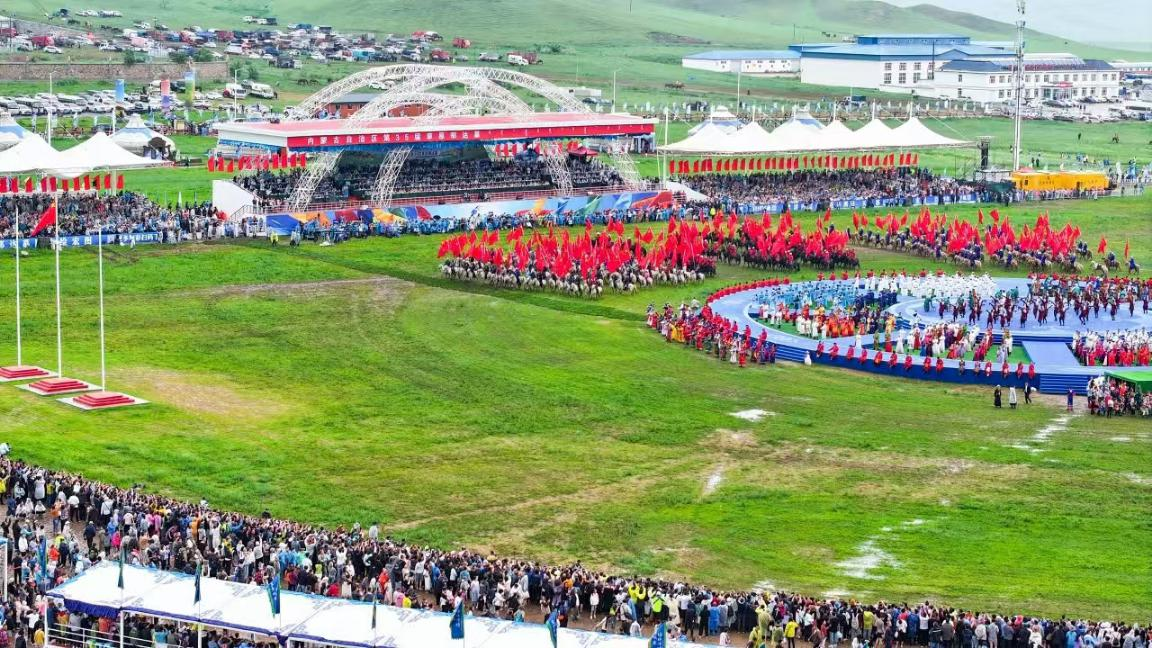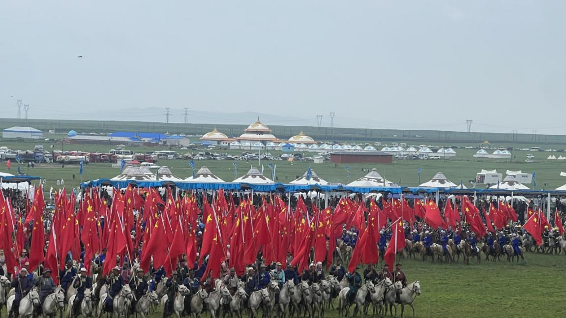在廣袤無垠、綠草如茵的錫林郭勒大草原上,“歌游內(nèi)蒙古 天天那達(dá)慕”—— 內(nèi)蒙古自治區(qū)第35屆草原那達(dá)慕開幕式熱鬧非凡。數(shù)萬名身著節(jié)日盛裝的各族群眾如潮水般從四面八方匯聚而來,將這片綠色海洋裝點得五彩斑斕。“鏡頭下的你和我” 游客抓拍活動瞬間點燃現(xiàn)場激情,萬人手機搖獎更是把大家的期待值推向頂點。隨著吉祥物 “達(dá)慕慕” 引領(lǐng)游客方陣歡快入場,十二盟市方陣身著特色民族服飾依次走過會場,這場草原盛會正式拉開華彩大幕。